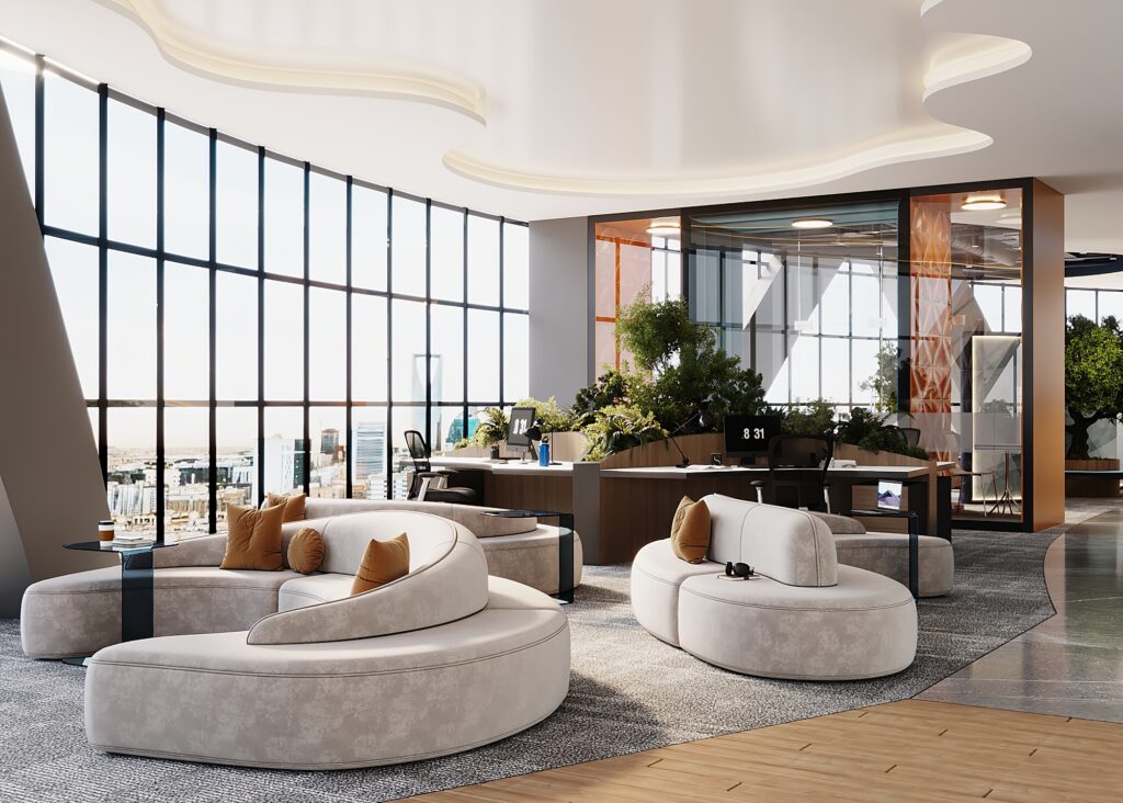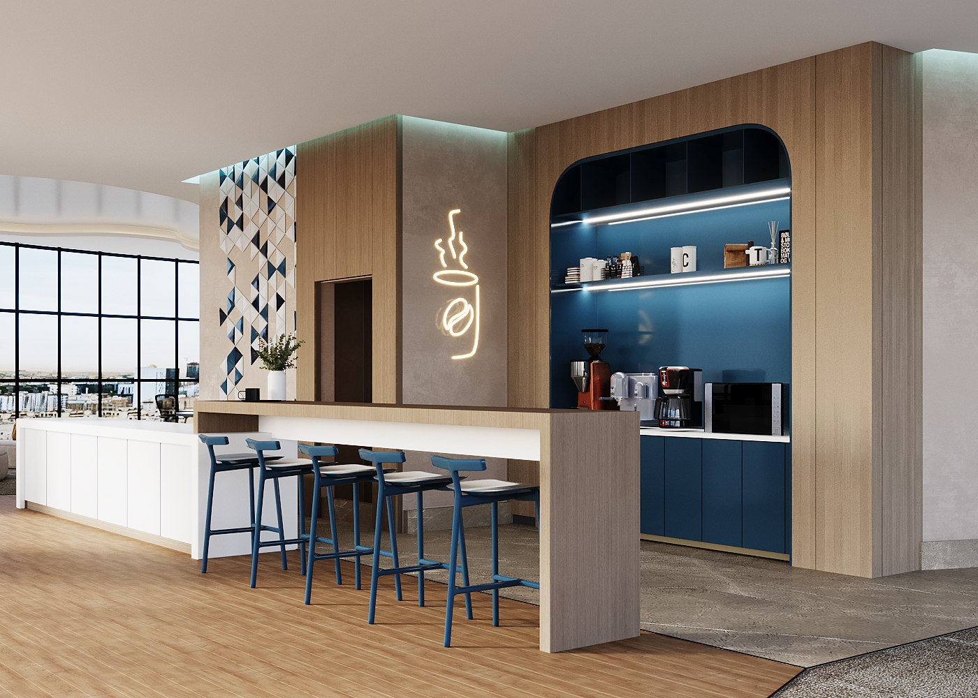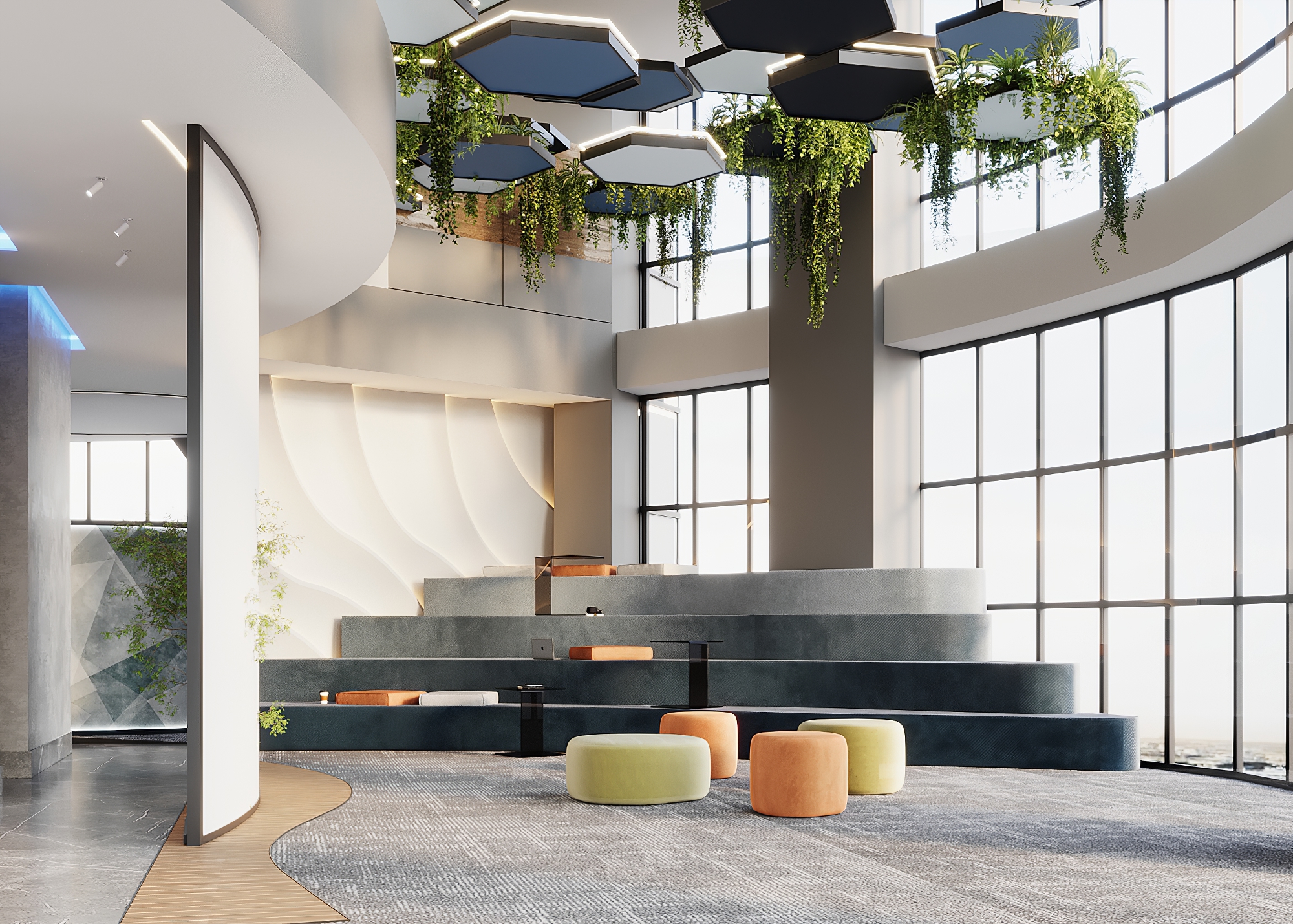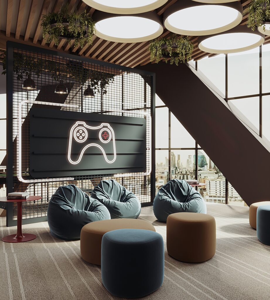 This office interior design places emphasis on the importance of teamwork. There are several areas in the office that are conducive to spontaneous collaboration and even a picnic table in the café to work, charge your laptop or talk to colleagues.well as reception areas, which are open and welcoming.