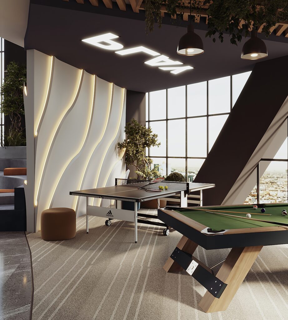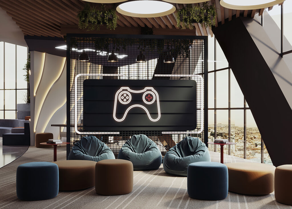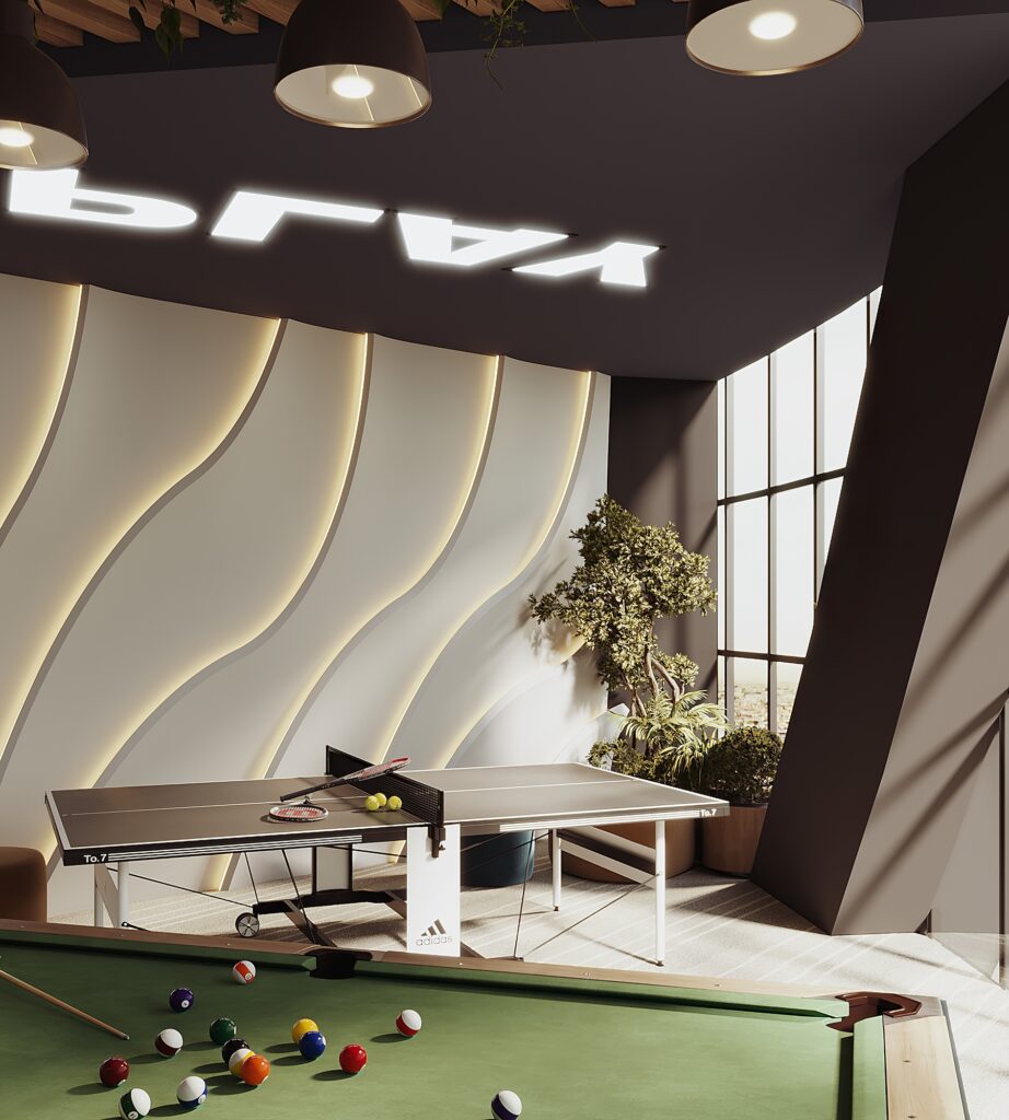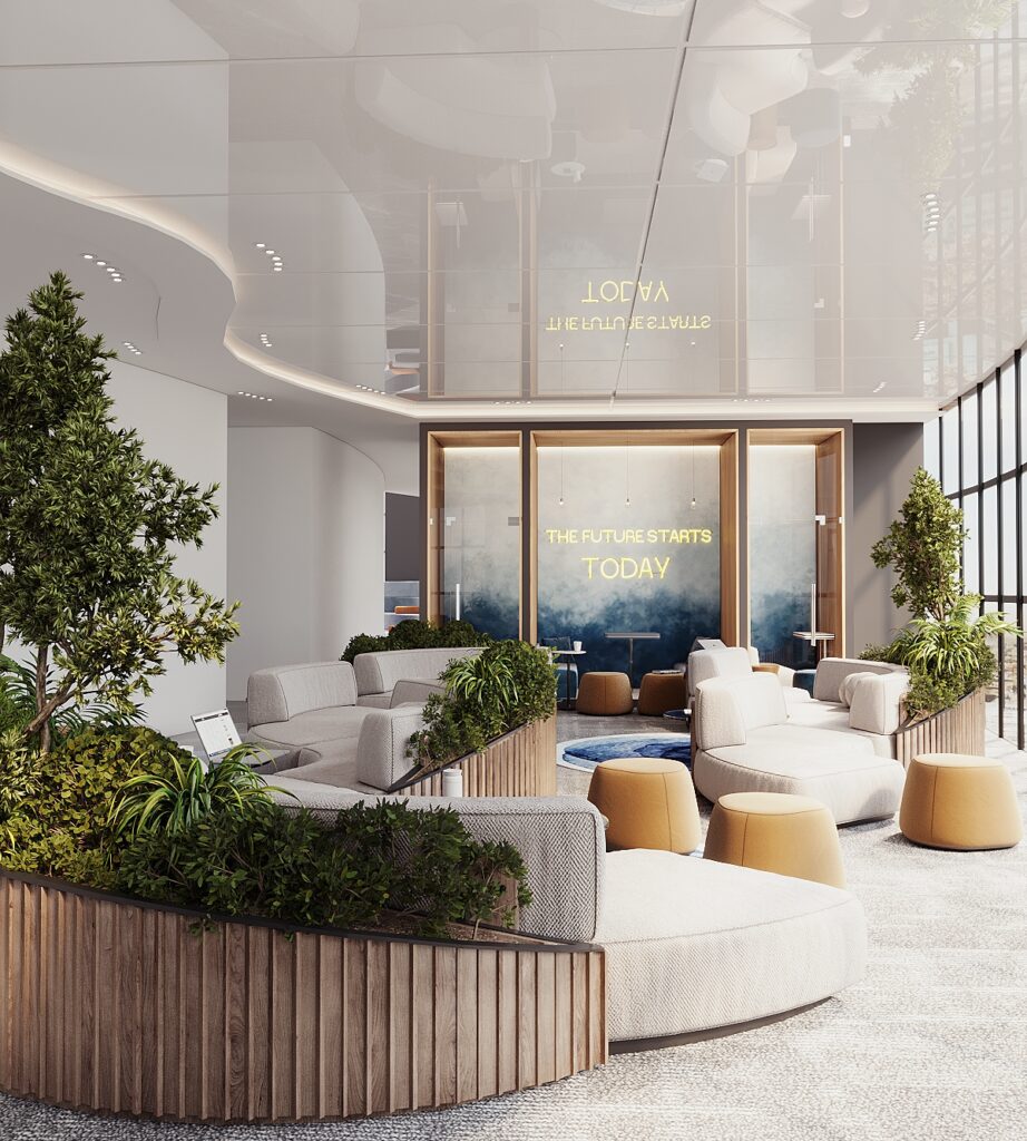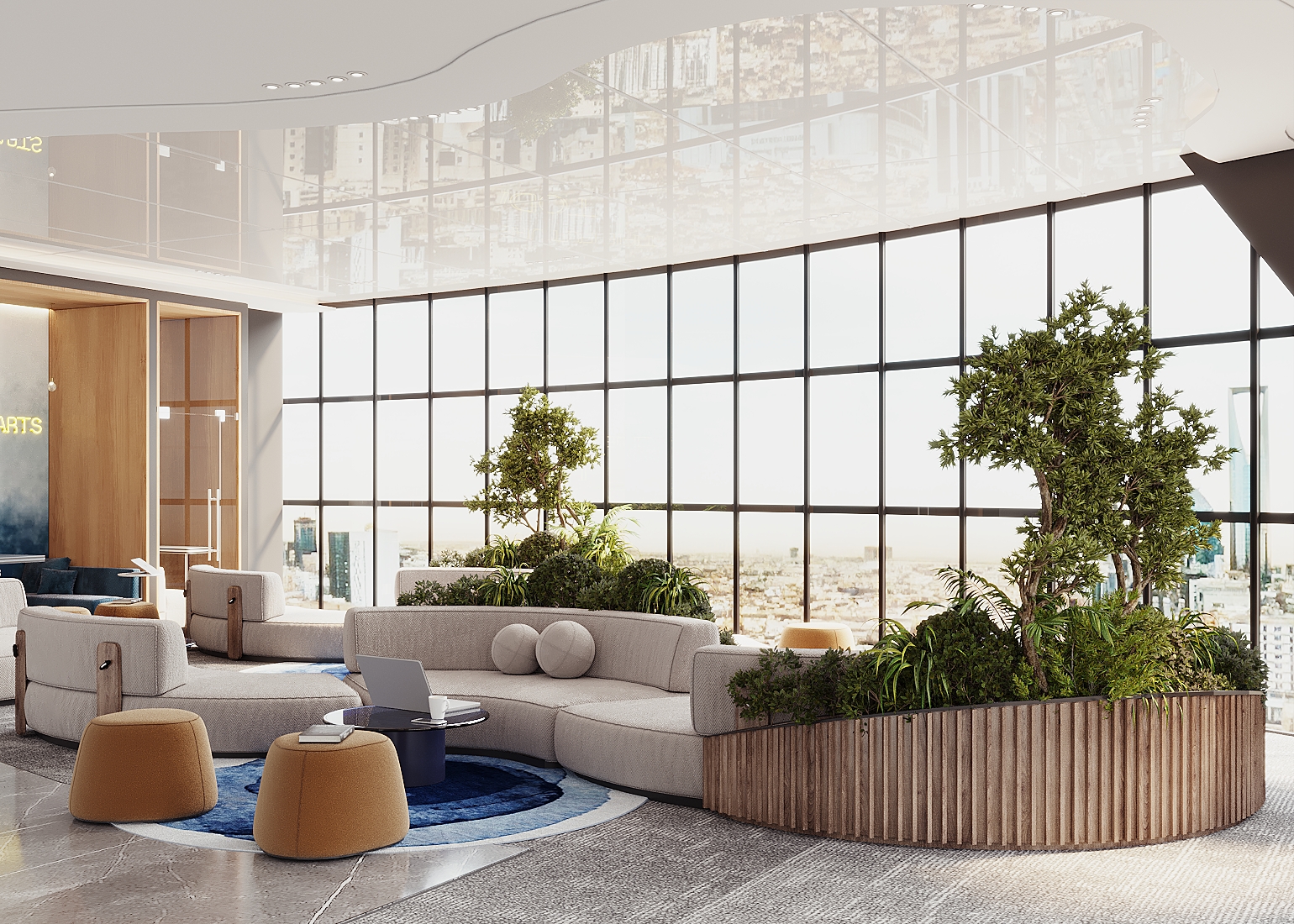 This office interior design places emphasis on the importance of teamwork. There are several areas in the office that are conducive to spontaneous collaboration and even a picnic table in the café to work, charge your laptop or talk to colleagues.well as reception areas, which are open and welcoming.